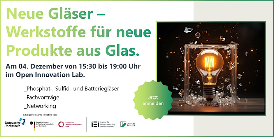 Die Veranstaltung findet am Donnerstag, den 04. Dezember 2025, von 15:30 bis 19:00 Uhr im Open Innovation Lab, Nürnbergerstraße 38, Haus Zapf 1, in 95448 Bayreuth statt und wird im Rahmen des Förderprojekts RIA der Innovativen Hochschule vom Keylab Glastechnologie organisiert.